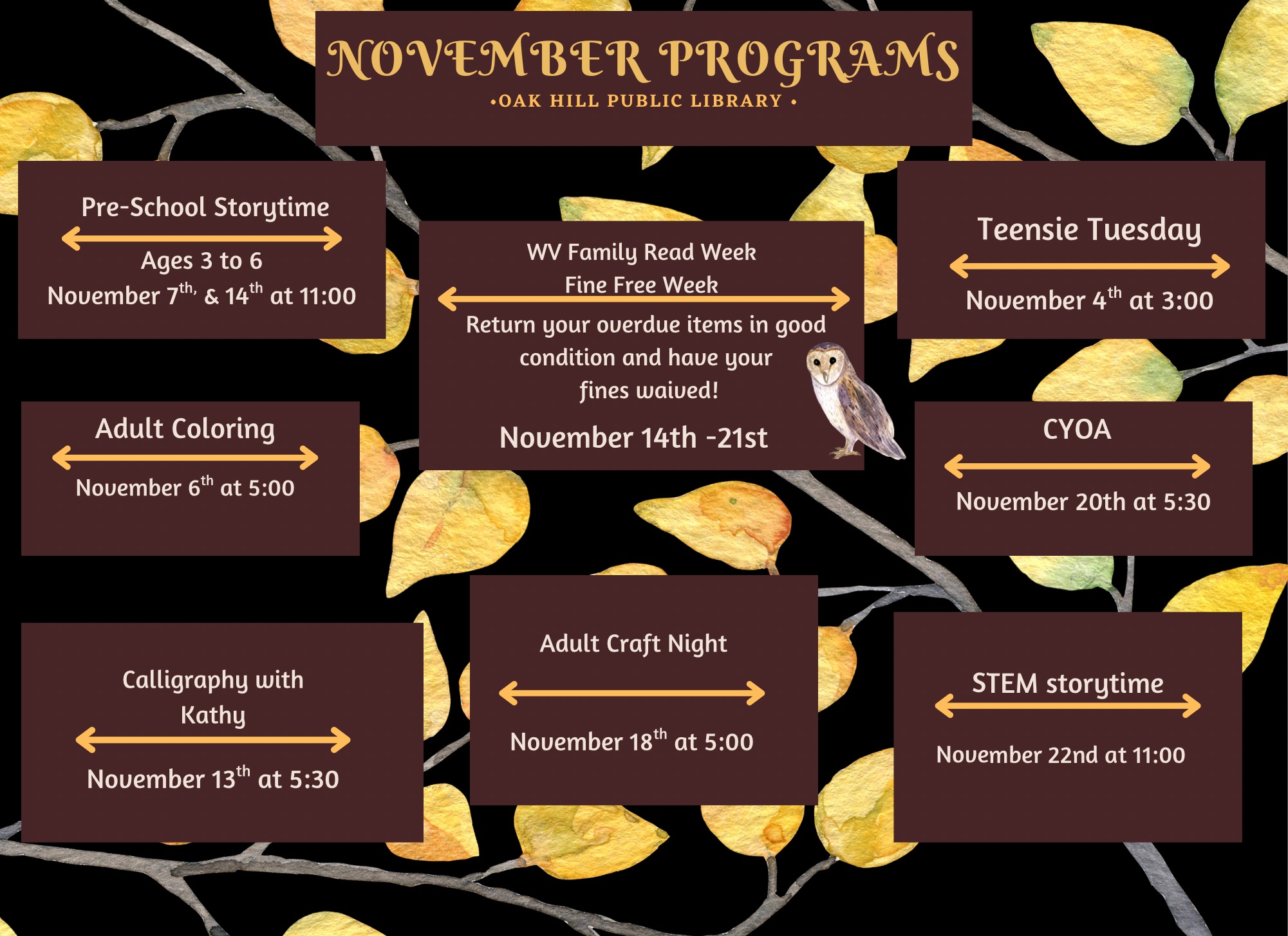 The Fayette County Public Library is so excited to present to you the White Oak Story Trail! It starts at the Depot on the White Oak Rail Trail and goes to Tom's.